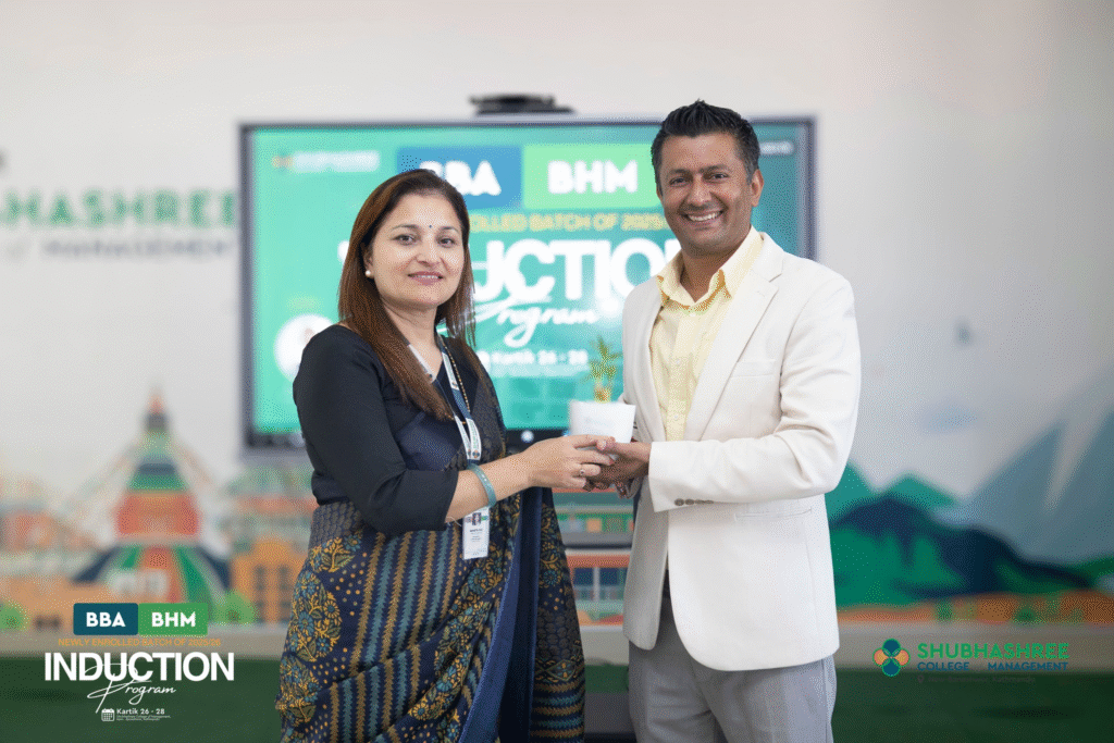 A heartfelt thank you to all our distinguished speakers — Mr. Rajan Koirala, Sandesh Jung Thapa, our Principal Ma’am, and MD Sir — for sharing their valuable insights and motivating words during the BBA & BHM Induction Program 2082. 🙏✨